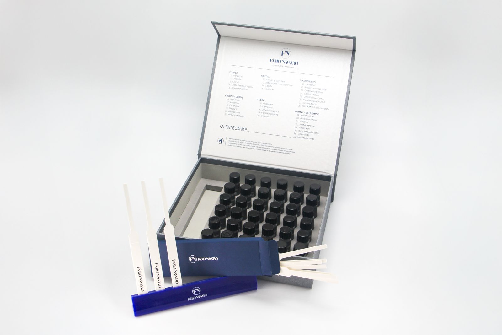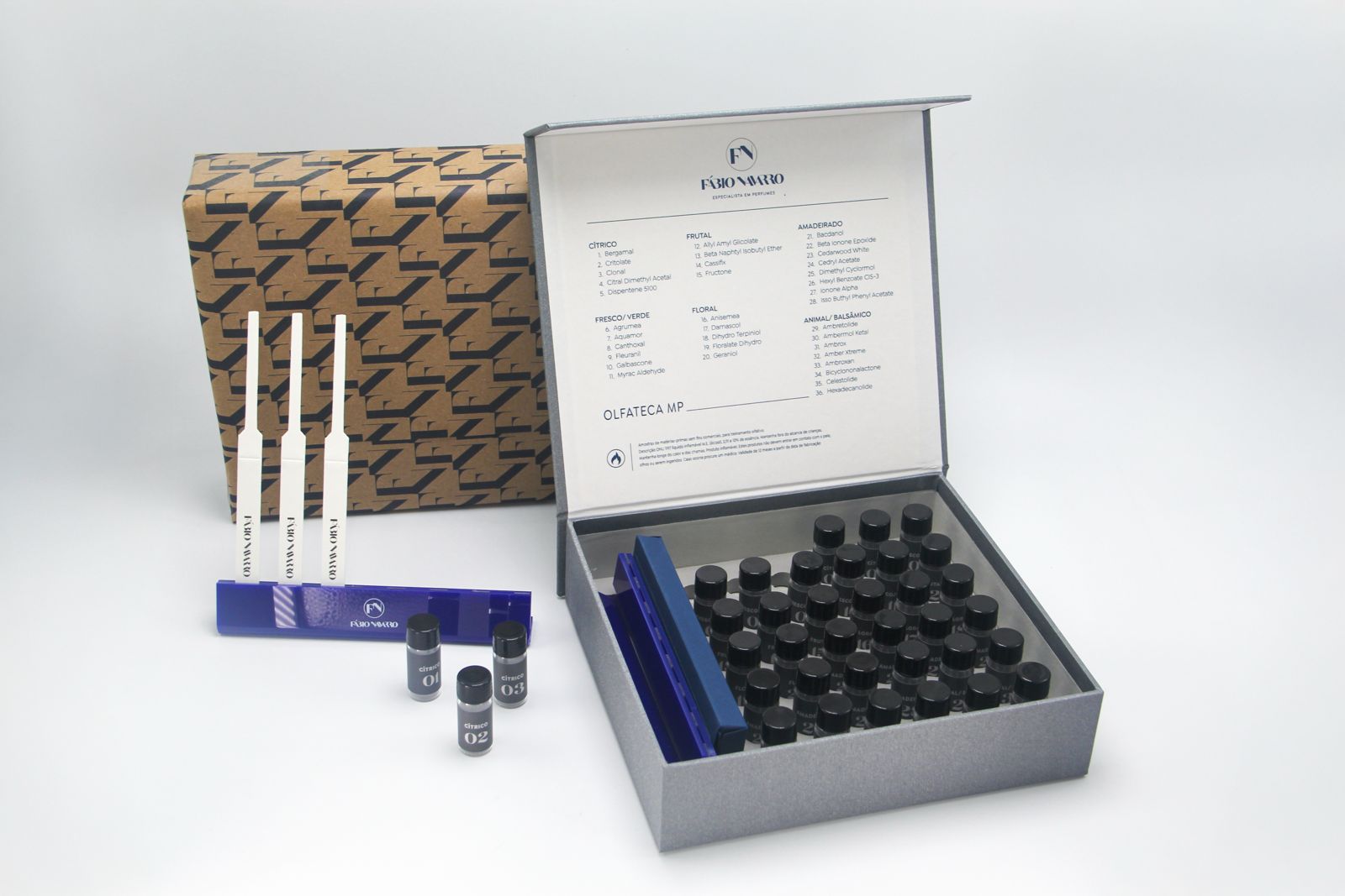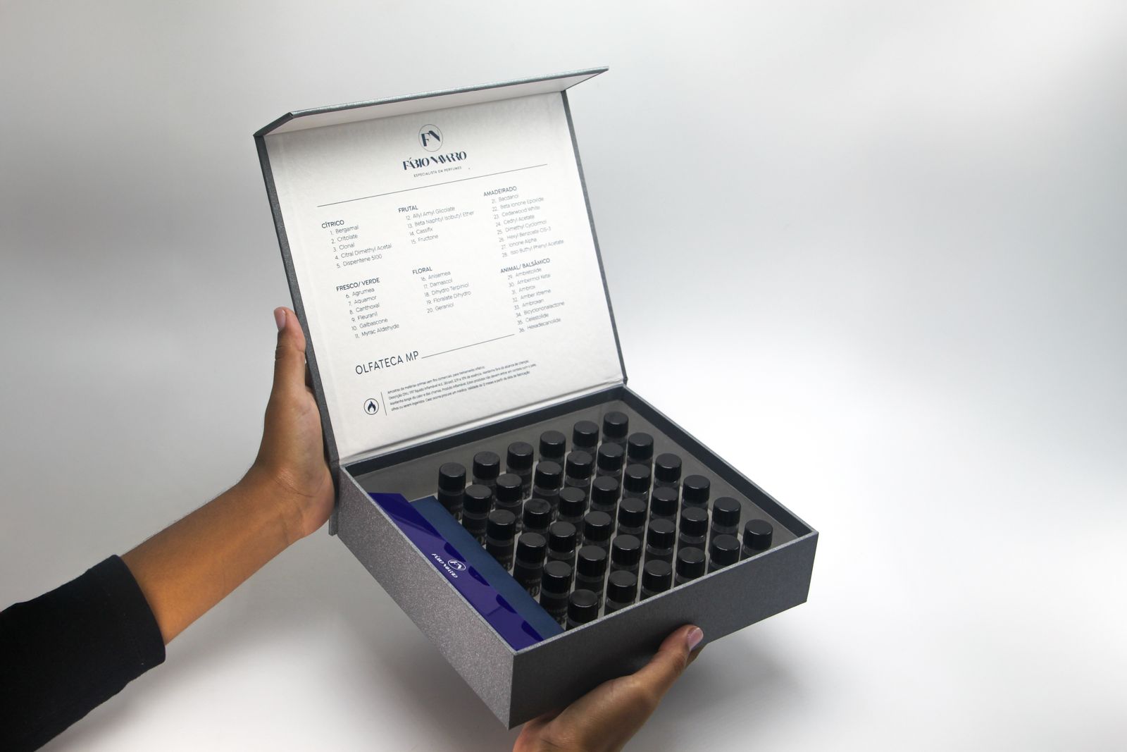 Matérias-primas sintéticas, divididos em 5 grupos olfativos (Cítrico, Frutal, Amadeirado, Fresco / Verde, Floral e Animal / Balsâmico) que te auxiliarão na sequência do seu desenvolvimento da sua biblioteca olfativa, ou aperfeiçoamento do seu conhecimento olfativo.